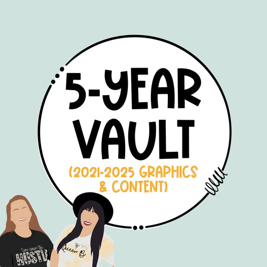The 5-Year Vault Engagement & Party Graphics, Content Calendars & Tee Party Planners (2021-2025)