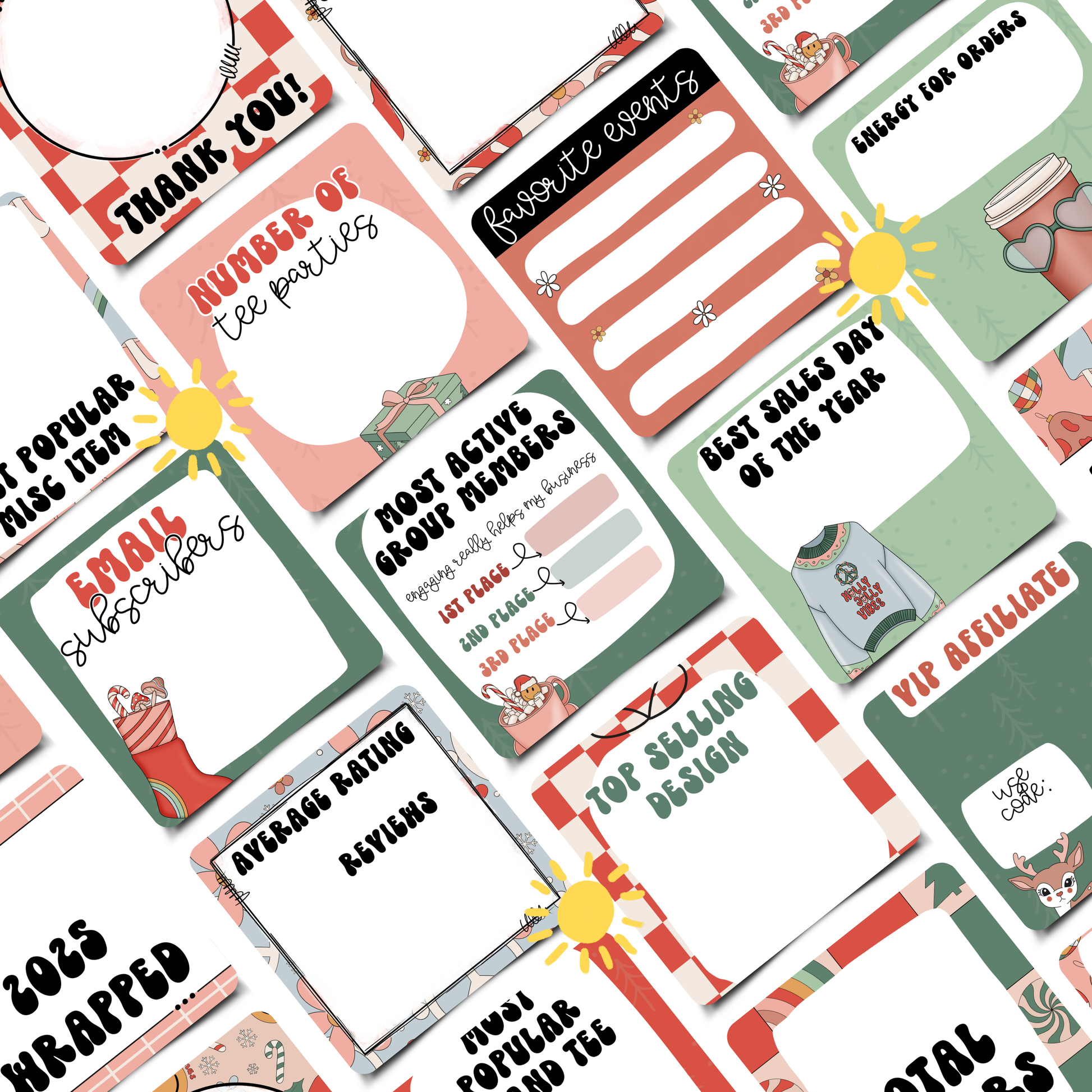 This set includes 20 done-for-you graphics you can fill in with your own stats like total orders, top selling designs, states you shipped to, busiest months, favorite events, and more. Think Spotify Wrapped but for your small business.