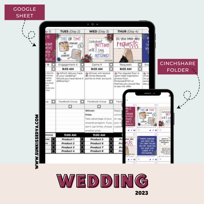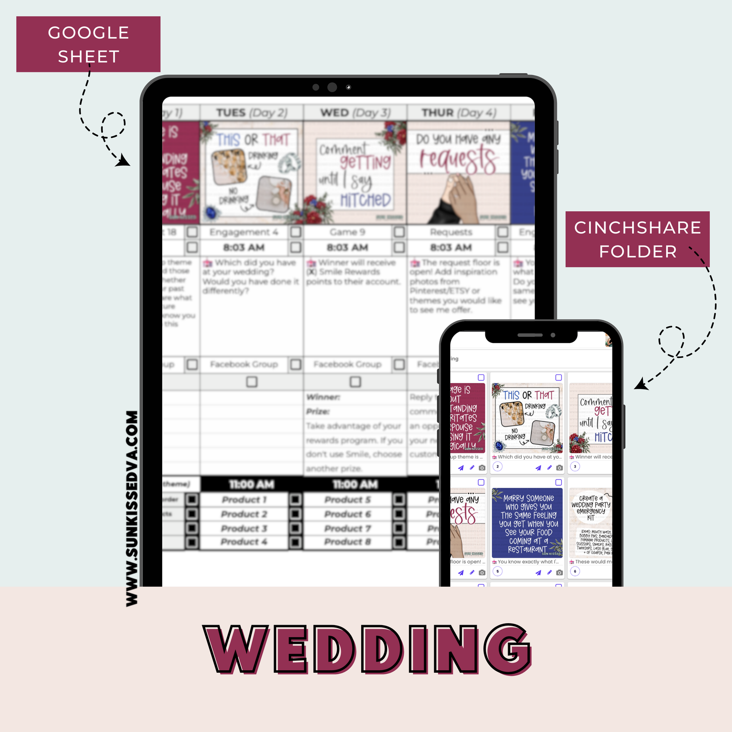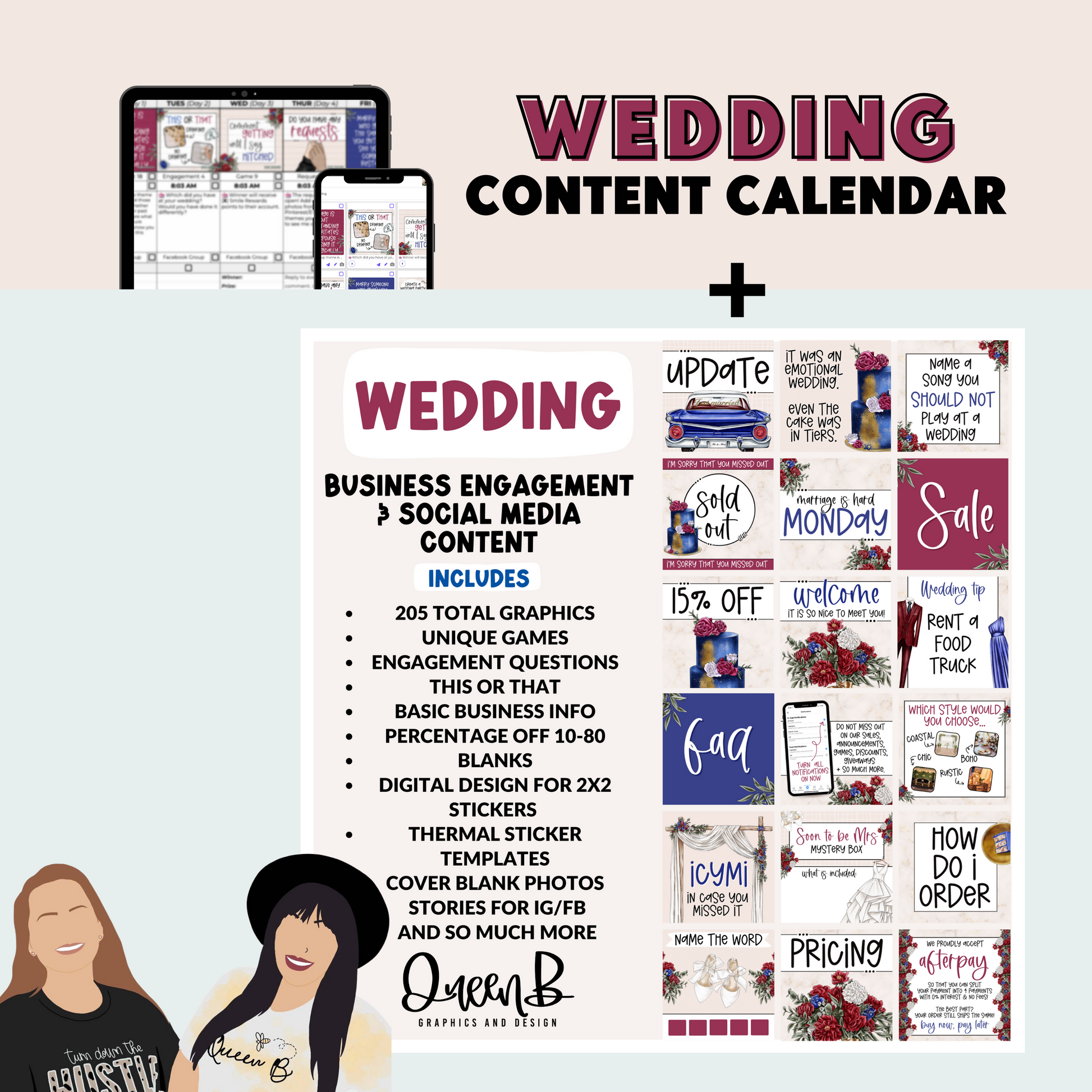 With this Wedding Content Calendar you get 5 weeks of wedding-themed engagement graphics + captions, so you can have fun with your followers and relive their special day! 💍💕